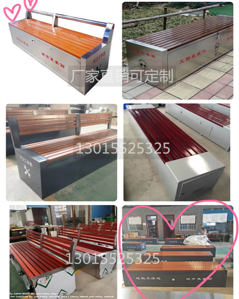 環(huán)衛(wèi)工具箱:也叫保潔員工具箱,環(huán)衛(wèi)工具椅,保潔員休息座椅,市政保潔箱等。工具箱常用尺寸為:長(zhǎng)2400*寬500*高550mm,也可以做成2米,2.4米,2.7米等,寬度和高度也可以定做,滿足不同客戶、不同場(chǎng)所的使用要求。